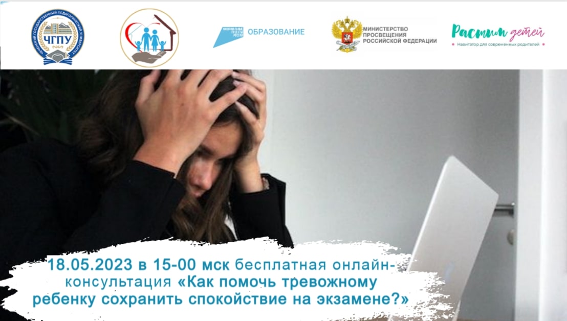 Приглашаем родителей на бесплатную онлайн-консультацию 18.05.2022 в 15-00 мск. по теме «Как помочь тревожному ребенку сохранить спокойствие на экзамене?». Консультацию проводит педагог-психолог высшей квалификационной категории Гебгардт Маргарита Сергеевна в рамках реализации федерального проекта «Современная школа» национального проекта «Образование» Сетевого консультационного центра комплексной помощи родителям "Родительский университет" Чеченским государственным педагогическим университетом.